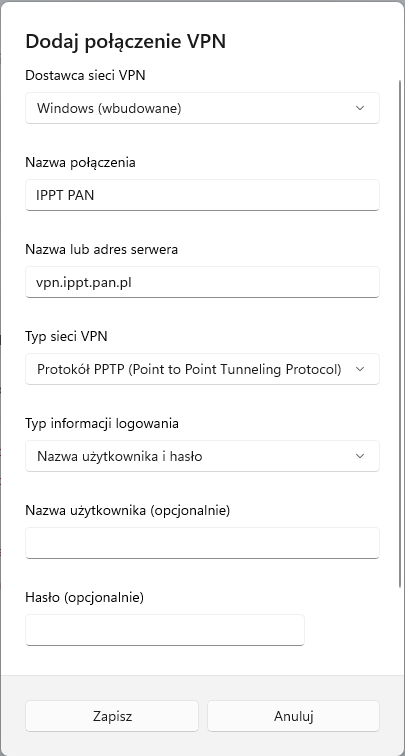 • W polu Nazwa lub adres serwera wpisz adres serwera VPNvpn.ippt.pan.pl